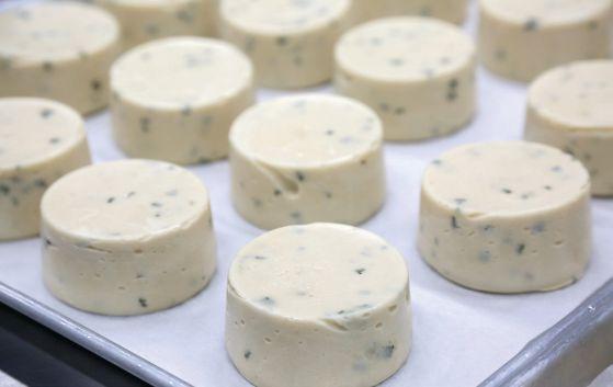 A close-up view of the hand-crafted rounds of plant-based cheese being placed inside the film-lined cavities of Variovac Optimus thermoform packaging machine prior to being sealed inside thermoformed film packs.