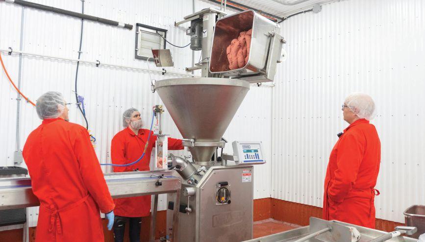 Top: Spring Meadows staff transfer a batch of freshly ground raw meat into the Reiser Vemag Robot 500 vacuum stuffer and portioner.