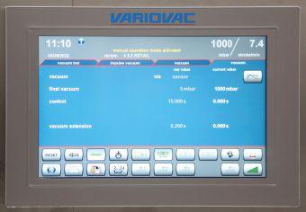 The user-friendly touchscreen HMI (human-machine interface) of the Variovac Optimus thermoform packaging machine facilitates very user-friendly programming and recipe selection.