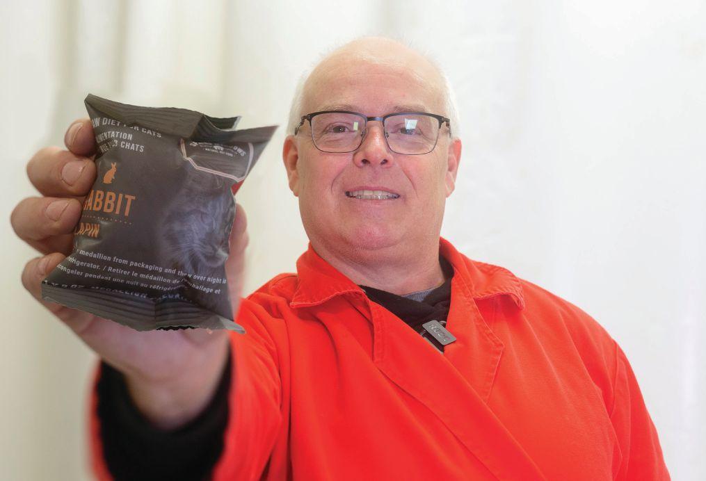 Jason Stovra proudly holds up a flexible flow-pack containing a nutritious, all-natural three-ounce serving of high-quality raw rabbit meat retailing across Canada under the company’s new Raw Whole Animal brand of premium cat food products manufactured in Saskatoon, Sask.