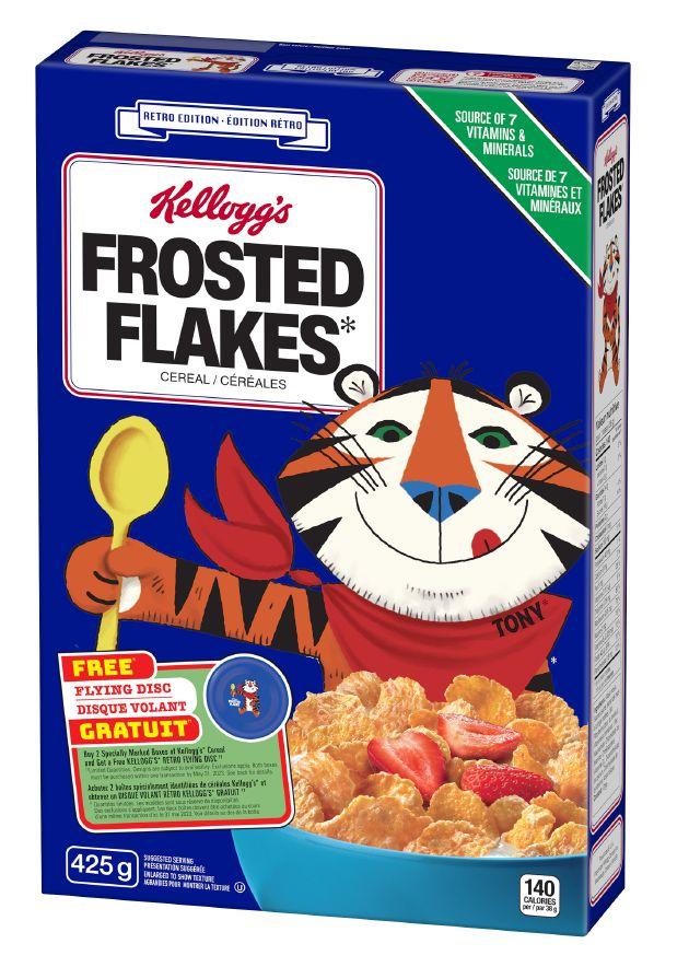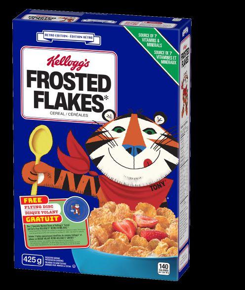 For Kellogg’s Frost Flakes, Tony the Tiger has been a “Gr-r-reat” brand ambassador since the product’s 1952 launch, including being voted into the Advertising Hall of Fame in 2004. Having first launched in Canada, the retro Frosted Flakes box features design elements from the 1970s and 1980s—including a two-dimensional tiger poised to dig his spoon into a bowl of Frosted Flakes cereal.