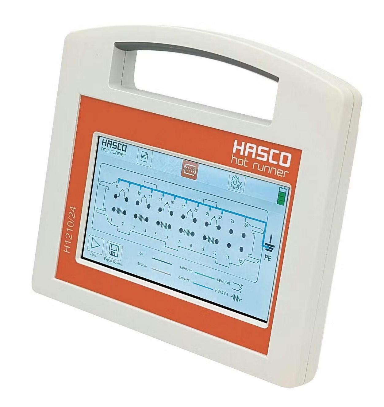 Hasco’s new H1210 hot runner mold testing device is a compact, battery-operated unit that identifies electrical connections – including heating elements, temperature sensors, ground faults, and wiring errors – within seconds, presenting the data both graphically and in table form. This makes it ideal for preventive maintenance, troubleshooting, and quality testing before production begins. The device features a seven-inch colour touchscreen with intuitive menu navi-