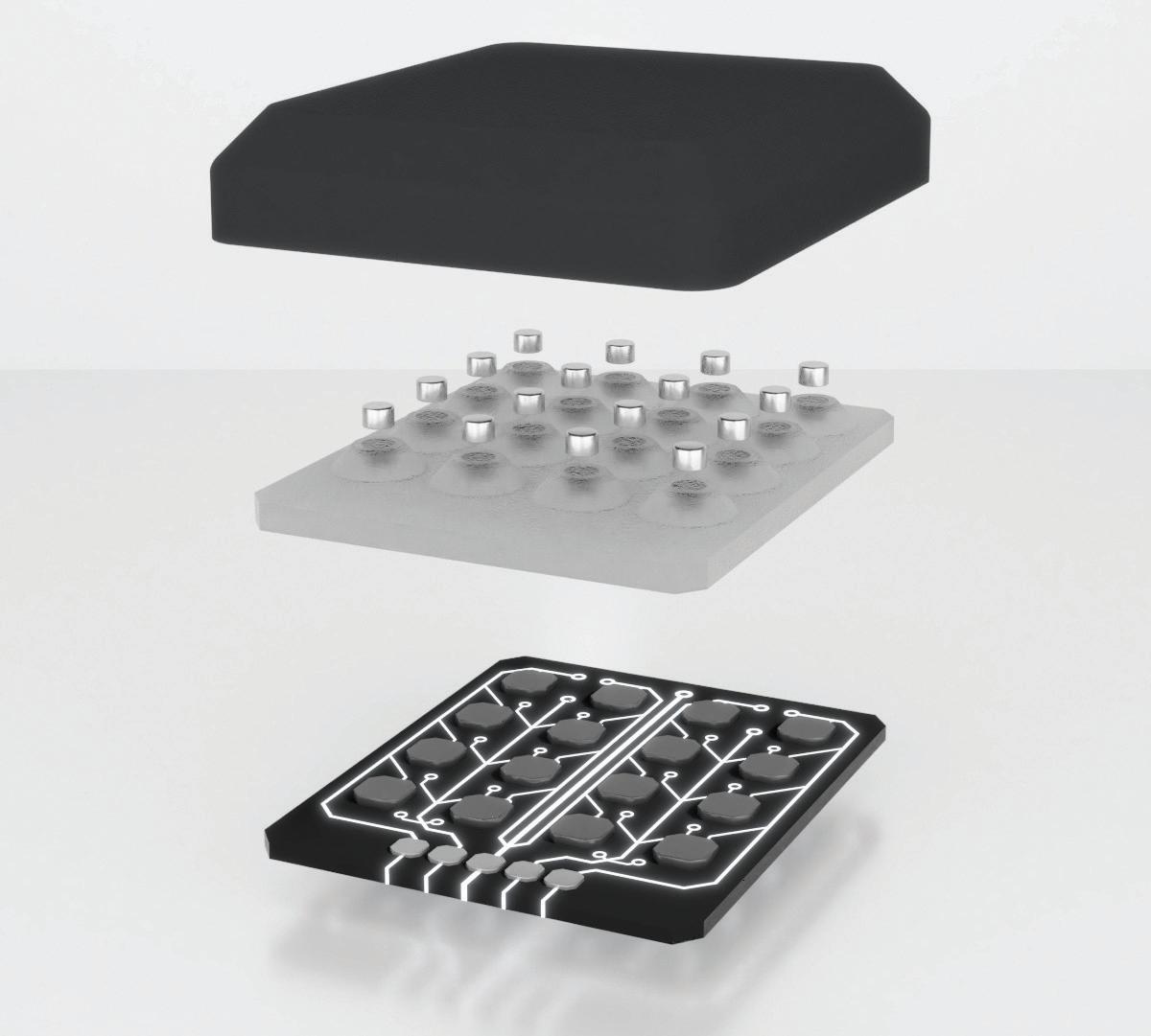 The uSkin consists of three main layers: a protective outer shell, a soft elastomer middle layer, and a bottom layer that’s a sensor module with a multitude of chips.