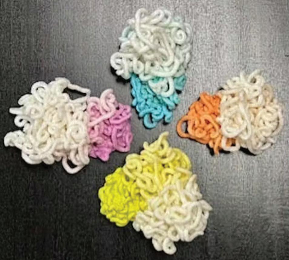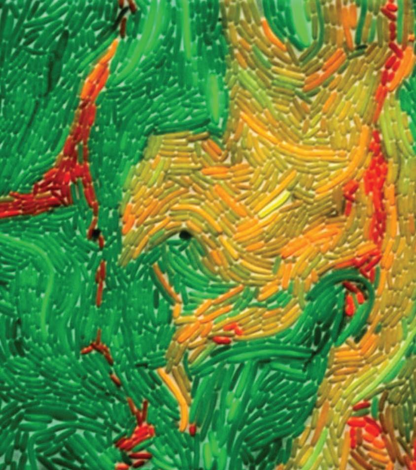 In this microscopic view, red and green cells exchange DNA molecules and start to turn yellow as they transfer a plastic-eating gene.