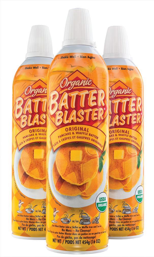 MONTREAL – Batter Blaster, the first ready-to-use organic pancake and waffle batter in a whipped cream-style can, is now available in grocery stores across Canada. Batter Blaster was named Brandweek’s Convenience Product of the Year and one of Good Housekeeping’s 100 Best Convenience Foods. Lower in fat, calories and sodium per serving than competitive pancake mix brands, Batter Blaster is certified Canada Organic and made from the highest quality ingredients, including organic eggs from humane, cage-free hens. The pressurized cans are made of recyclable steel. For more information, visit www.batterblaster.ca.