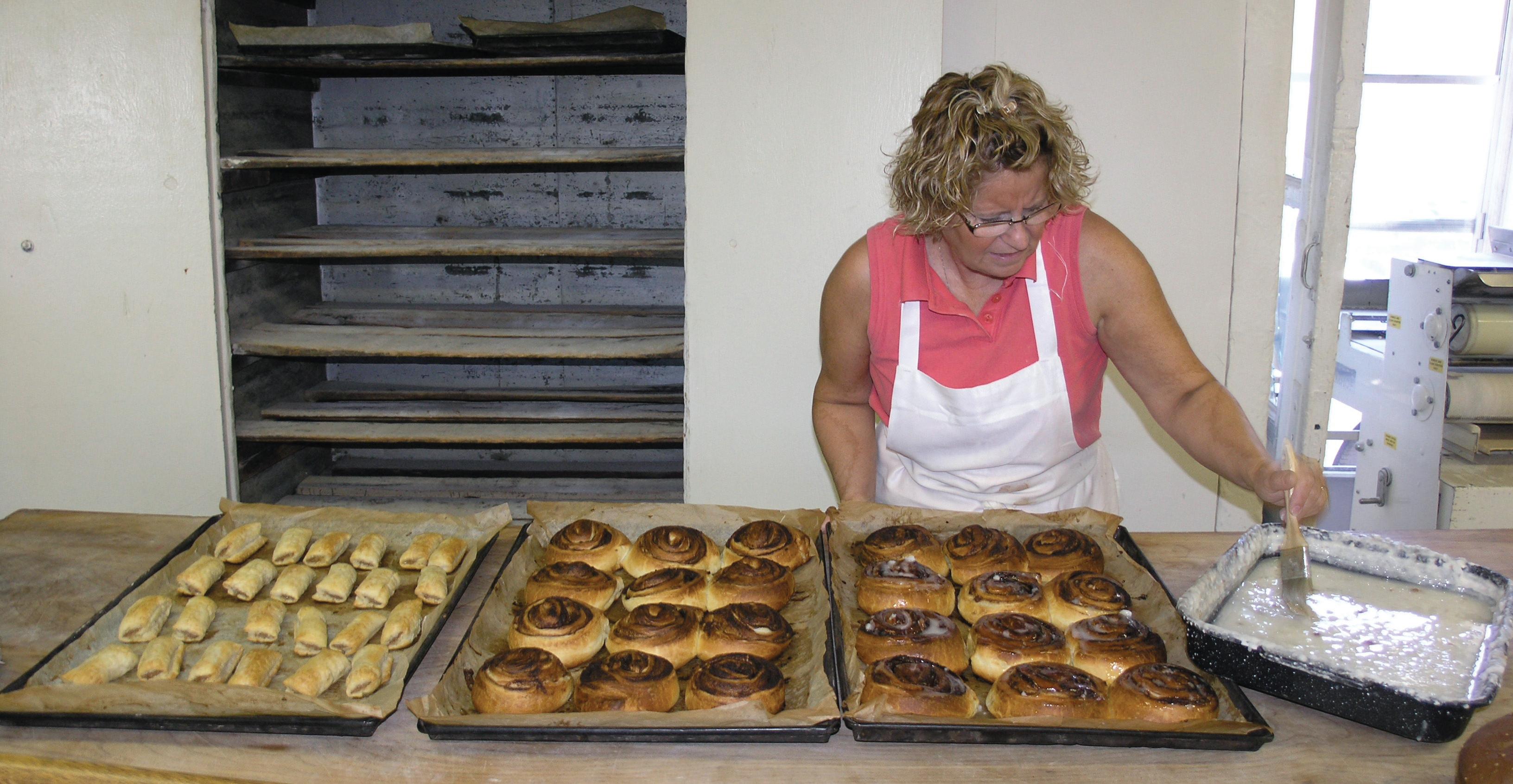 Debbie Wilson glazes some cinnamon rolls fresh out of the oven at Grahame’s Bakery.