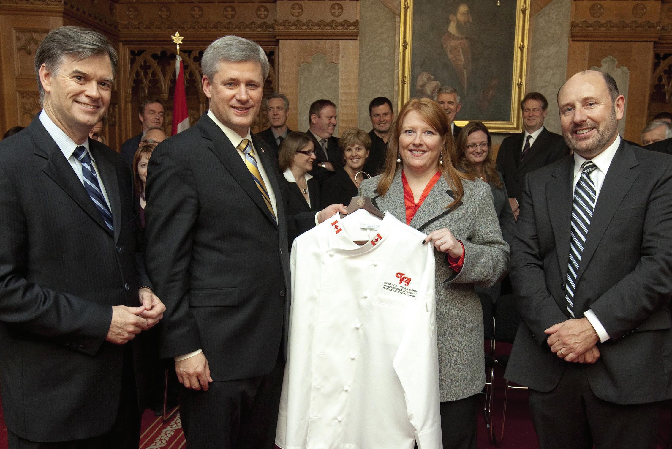CRFA chairman Brenda O’Reilly of St. John’s and first vice chairman Gerard Curran of Calgary presented Mr. Harper with a personalized chef’s jacket from CRFA.