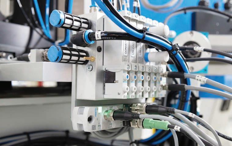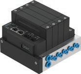 Employing Festo’s CPX-AP-I low-voltage network in its latest CNC centres and production lines allows Pro-Line to use skilled labour more efficiently. Key components like the VTUG valve manifold (top) and CPX remote I/O modules (below) connect to the PLC via the CPX-AP-I Control module rather than to the bus backbone.