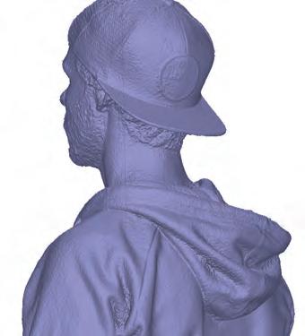 a 3D mesh model. To capture those images, Selftraits employs the “Cobra,” a large tomato-shaped pod, or 360 degree photo booth, inside which clients strike a pose. Following a short countdown, the Cobra’s 128 cameras fire simultaneously, capturing photos of the subject from all angles and multiple levels.