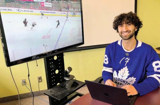 Liam Salass, a U of W graduate student and a lead researcher on the AI-based PLUCC system, tests the technology while showing his hockey colours.