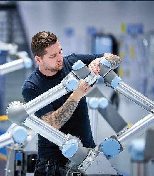 haven’t used robots before, cobots offer a quick entry into automation thanks to their easy programming, usually through hand guiding or tablet interfaces. Also, cobots can sometimes allow for fenceless applications directly integrated into existing production areas; and can adapt flexibly by using plug-andplay technologies, making them attractive for companies that don’t have engineering experts, with low-volume/ high-mix manufacturing environments, and in industries where production needs are constantly changing.