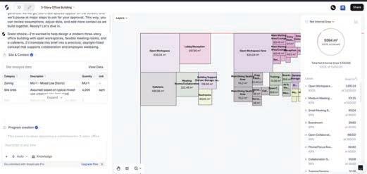 The one firm I found furthest along is an architectural one, Snaptrude. With it, you enter a one-line prompt, such as “Design a three-story office building with open workspace, meeting rooms, and cafeteria,” and then it spends ten minutes generating and optimizing an initial room layout that meets the specs of building codes –happily chattering to you as it carries out the determinations.