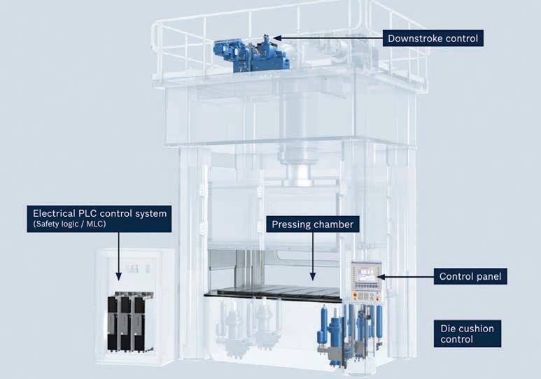 a smaller press module from the point of view of the load spectrum. An expensive “size jump” can also be avoided. Together with the Bosch Rexroth’s Motion Control System MLC and the Safety Logic safety control system, users benefit from a ready-toinstall state-of- the-art system which minimizes internal process costs at the same time. Press modules that are optimized for efficiency and feature a standardized safety concept and test certification offer machine manufacturers the opportunity to gain a range of attractive competitive advantages. These range from safe operation with minimal residual risk and a better energy balance of the press to a lasting reduction in costs thanks to downsizing and considerable time savings for engineering, commissioning and assembly.