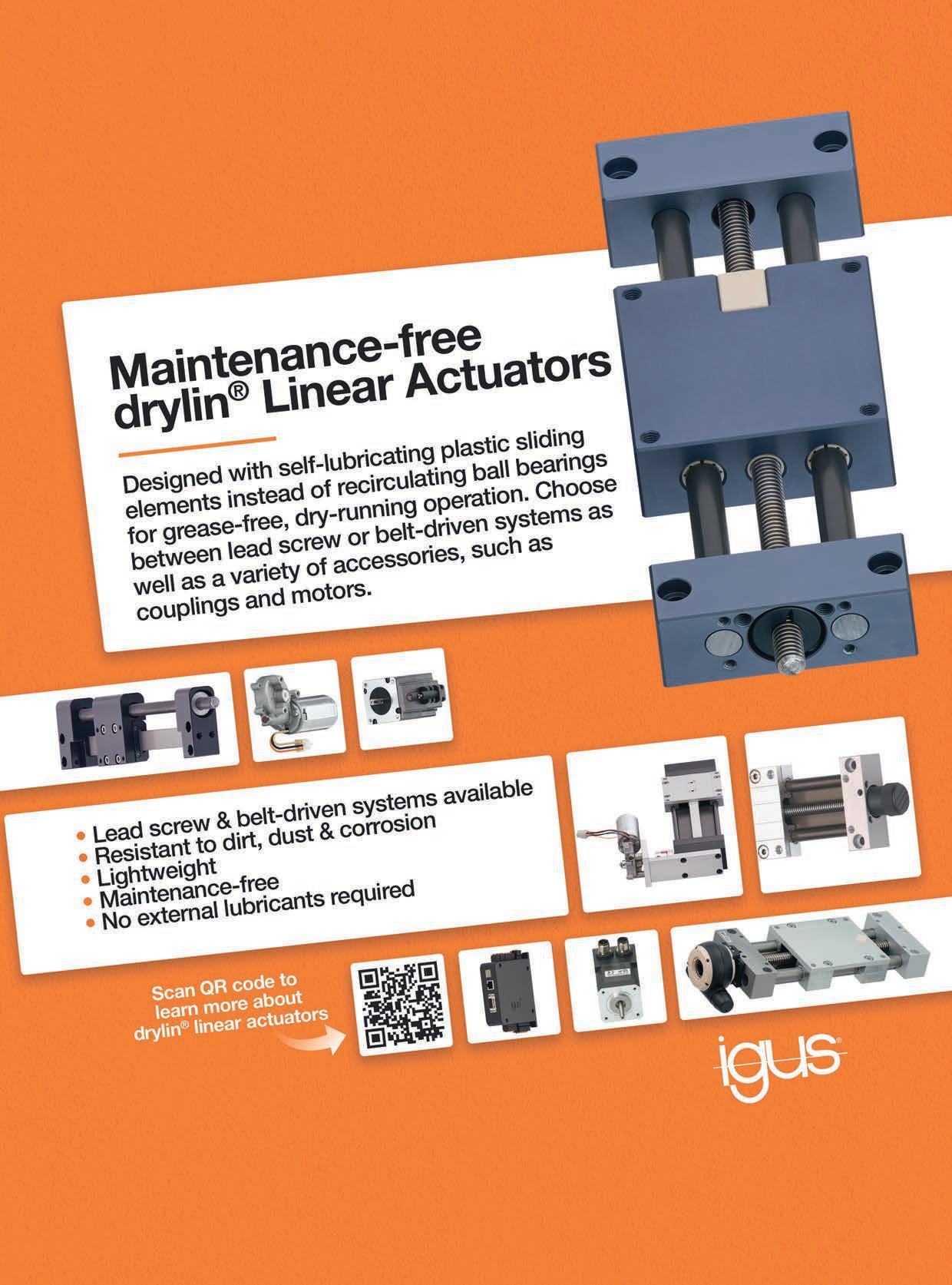 designed for forces up to 7,943 lbf (35kN), speeds up to 20 in./sec (498mm/sec) and stroke lengths up to 48 in. (1,200mm). It is available in both ball screw and roller screw options. All Tolomatic actuators are designed with the company’s Endurance Technology, a design principle that incorporates features designed for maximum durability and extended service life, the company says. www.electromate.com