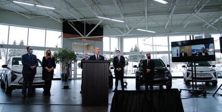 (From left:) Members of the House of Commons: Fayçal El-Khoury, Patricia Lattanzio, and Jonatan Julien, and Quebec’s Minister of Energy and Natural Resources, François-Philippe, at the General Motors Co. and POSCO Chemical announcement to build a cathode active material processing facility in Bécancour, Quebec.