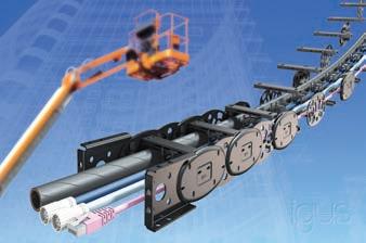 igus has developed the YE.4, a hybrid plastic-steel energy chain for vertical guidance of cables and hoses. The system’s supporting chain links are made of steel, whereas the pin/bore connection, the outer links and the crossbars are made of a tribologically optimized high-performance plastic. The hybrid chain is 50 percent lighter than steel chains and compared to a traditional plastic chain,