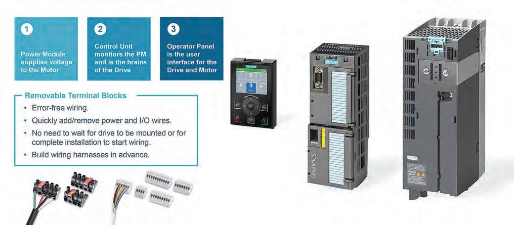 A basic modular drive consists of a power module, control unit and an operator panel. The power module supplies voltage to the motor, while the control unit monitors the power module and is the brains of the drive. The operator panel is the user interface for the drive and motor control. OEMs can prewire the drives before