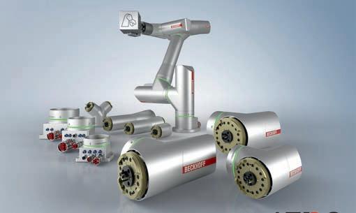 robot or cobot needed. The motor modules are available in straight modules in I-shape or angled modules in L-shape, which are designed in five power sizes. Each motor module forms a complete drive system for one axis of the robot. The adapted structures are scanned by the control software, and the TwinCAT robotics functions automati-