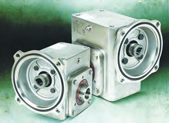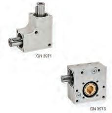 housing lengths between 1.26 and 2.36 inches (32 and 60mm) and widths between 0.71 and 1.38 inches (18 and 35mm). The gear shafts can receive axial and radial forces of 13.9 lbf (60 newtons) on the smallest model and 124 lbf (550 newtons) on the largest. The GN 3975 worm gear reducer measures 2.36 inches (6mm) on the sides and 1.38 inches (35mm) in width. Seven versions provide gear ratios between 1:13 and 1:65. The maximum radial and axial force ranges between 44.96 and 112 lbf (200 and 500 newtons) on