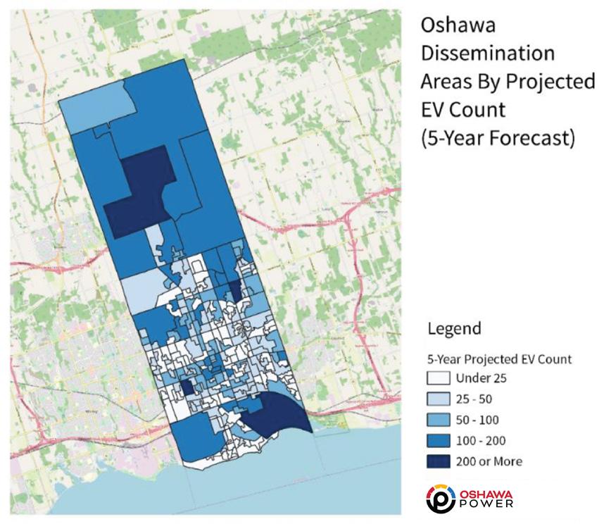 The algorithm’s successful implementation allowed Oshawa Power to begin developing an internal analytical tool that will effectively pinpoint which residences are actively using Level-2 chargers, accurately quantifying how much of the total residential load is attributable to EV charging. Additionally, the project team leveraged Oshawa Power’s data and publicly accessible demographic data to conduct a comprehensive propensity study, projecting total EV uptake and predicting adoption trends over the next five years.