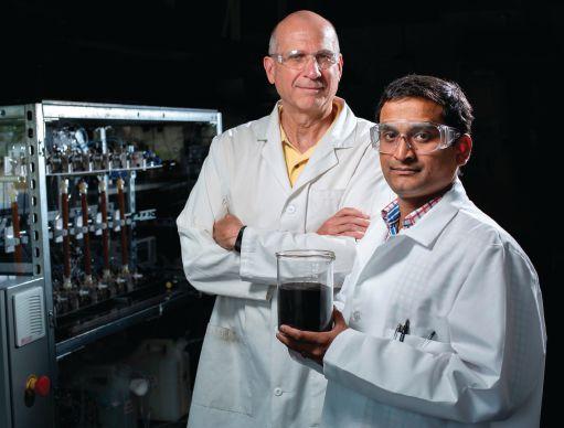 Iowa State University’s Robert C. Brown and Santanu Bakshi display a beaker of biochar, which they say could help protect farmlands from extreme weather events. Photo courtesy Christopher Gannon.