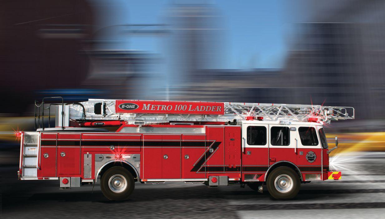 Offered exclusively by E-ONE, the all-new Metro 100 is a single axle aluminum ladder with a 100’ vertical reach on a short 220” wheelbase. The 11’ jack spread allows you to easily set up in tight spaces. And, when paired with the Cyclone II aerial cab, the Metro 100 offers an impressively low 10’7” overall travel height. Designed with both the urban and suburban departments in mind, the Metro 100 is a highly maneuverable ladder that’s long on features and short on height.