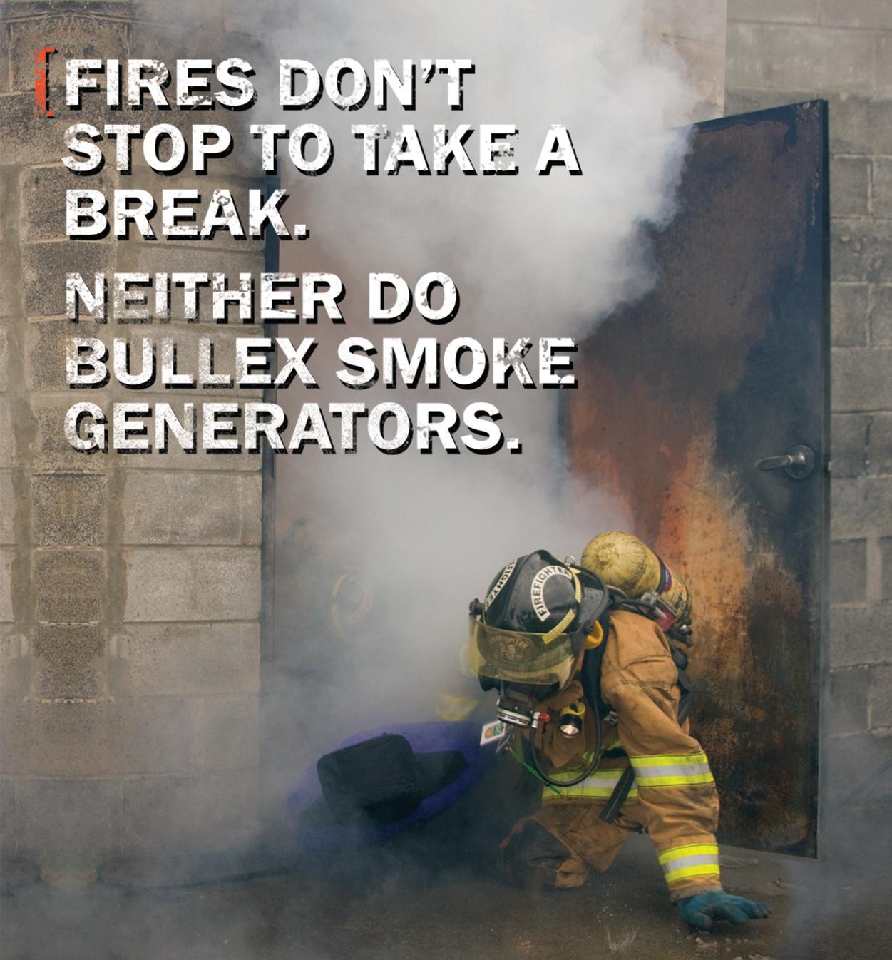 you’re doing search & rescue, ventilation or initial fire attack drills, these Smoke Generators don’t stop until your training is done.To see the Smoke Generators in action, check out our videos at www.bullexsafety.com