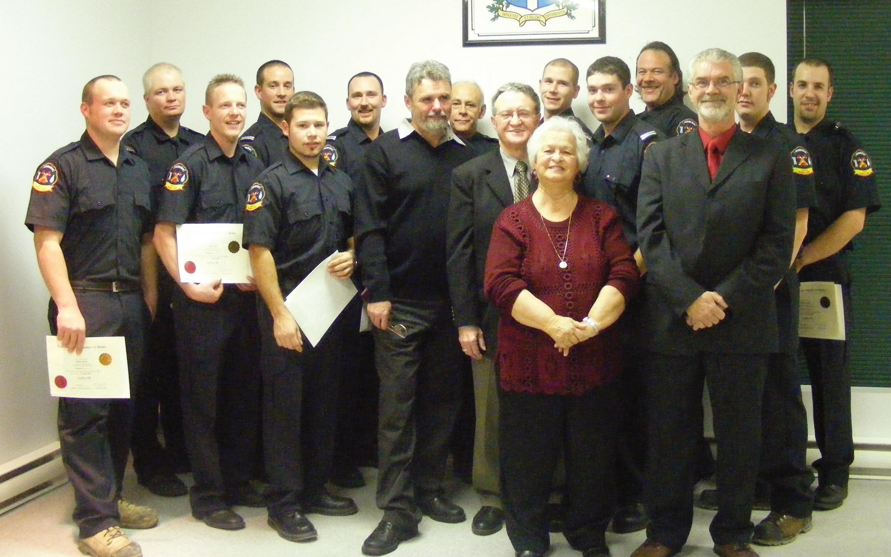 On Dec. 3 2009, after two years of courses, 14 firefighters from the Mayo – Mulgrave & Derry Fire Department in western Quebec received their Firefighter I diplomas from the Quebec National Firefighters School. Pictured are (left to right) Martin Dionne, Chris Achtell, Curtis Lavell, Lt. Kevin Berndt, Eric Berndt, Lt. Sylvain Laframboise, Mayor of Mulgrave & Derry Michel Kane, John Rae, M. Gilles Lavergne of the Quebec National School for Firefighters, chief administrator for MRC Papineau Paulette Lalande, Jesse Carling, Lt. Brandon Lalonde, Ron Laurin, Mayo Mayor Gaetan Brunet, Chris Farnand and Simon Cadieux. Adam Achtell and Eric Gagnon were also part of the graduating class.