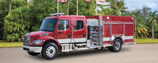 This side mount Rosenbauer Maverick commercial pumper-tanker built on a 2023 Freightliner M2-106 4-door cab and chassis with a 360HP Cummins L9 engine and a Rosenbauer 1/8” aluminum extruded and formed body. Rosenbauer swivel dump, Federal Signal siren/warning/scene light package and a Rosenbauer EZ-Climb rear access ladder.