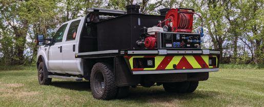 Built on a Ford F-450 Super Duty chassis, the OTEX RANGER UHP-20 skid unit comes equipped with a 300 USG tank with a 15 G foam cell, a 20 GPM ultra-high-pressure pump with a precision foam system, 200 feet of UHP handline, an Elkhart pistol grip nozzle, FRC tank level gauges and auto water and foam tank refill.