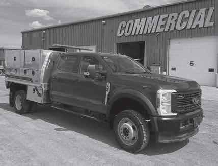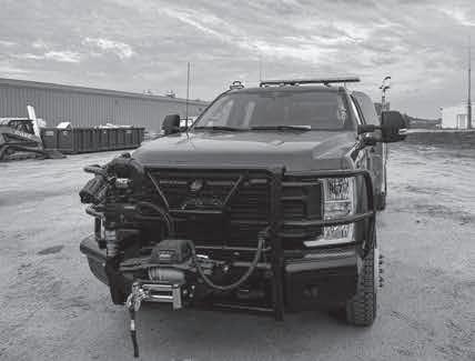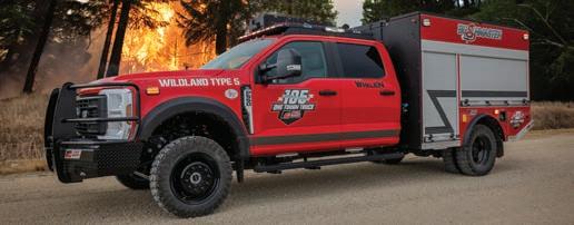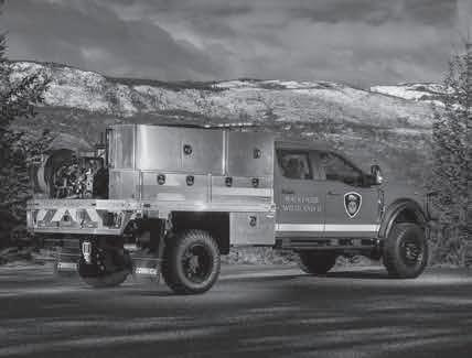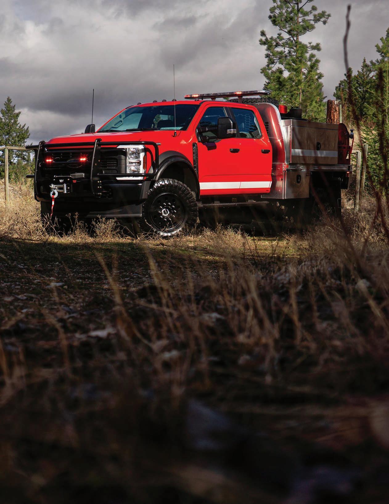 This wildland truck, built on a 2024 F-550 crew cab and chassis, is equipped with a 350 HP 7.3L OHV 16 valve V8 engine. Features include a Bulletproof front bumper with a 16,500lb Warn winch, Bulletproof super singles conversion wheel kit. The CET Fire Pump Mfg. package features a 400 USG water tank, 10 USG foam cell, CET PFP-20hpHND-MR mid-range pump and a 4171 Scotty foam system.