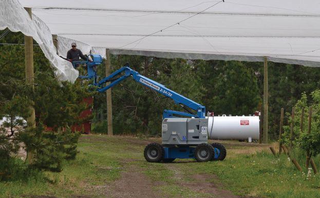 Drape netting, the second style, is becoming popular in Washington state. Initial costs are lower, as it can use existing high-density trellis systems, and there is also significantly less labour and equipment involved for seasonal set up and take down. Drape netting can also be cinched at the bottom to provide insect and bird protection.