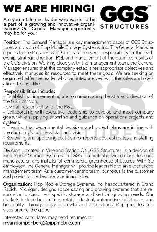 RATES: Minimum order $75.00 or 84¢ per word, word ads must be pre-paid. CLASSIFIED DISPLAYS: $72.00 per column inch. GENERAL INFORMATION: Payment must accom- pany order. Copy required on publication close date. All advertising copy subject to the approval of the publisher. Send order and remittance to: Classified Dept., Greenhouse Canada, P.O. Box 530, Donly Dr. S., Simcoe, ON N3Y 4N5 Canada