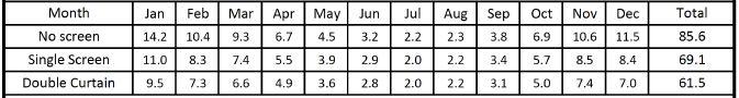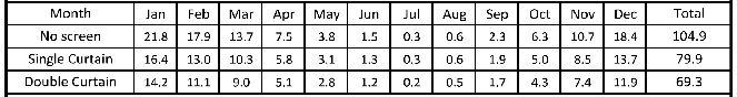 supplemental lighting and in different parts of Canada. In other parameters the greenhouses are the same (e.g gutter height, use of natural gas heating, etc), and common temperature setpoints and curtain control setpoints are used for the different crops. In each scenario, the energy saved by utilizing one or two curtains is compared to a reference of not having a curtain present in the greenhouse. A description of each scenario is followed by a graph and table of the energy savings, along with some explanations.