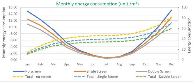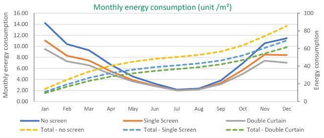 Within each scenario, the energy calculator tool is utilized to simulate the energy savings gained by using curtains in one-hectare vegetable greenhouses, with different covers, differences in