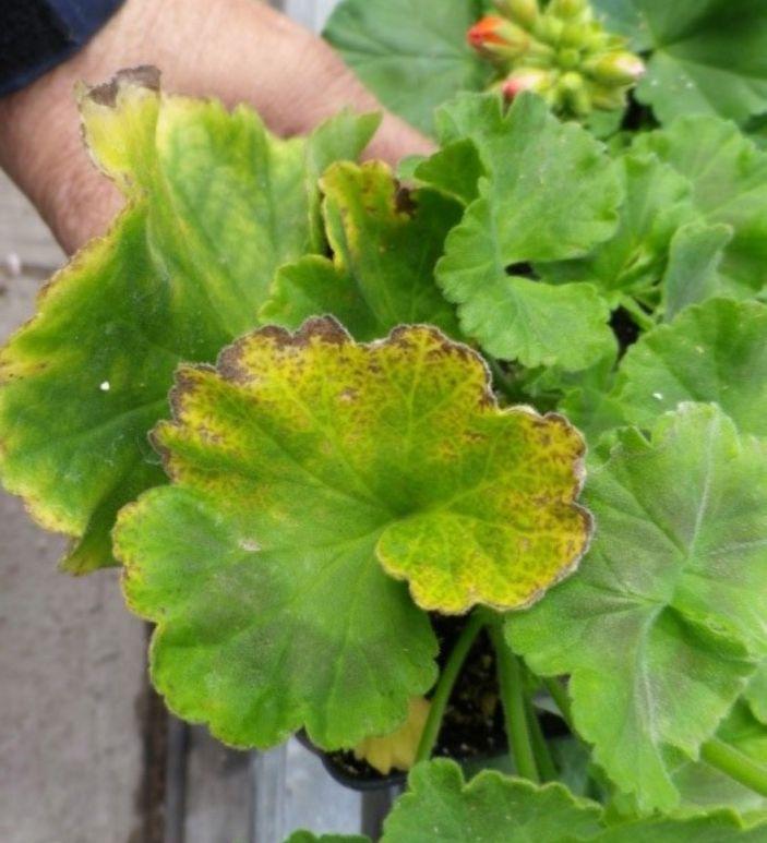 The speckling seen on leaves (like in Image 2) is an accumulation of iron and likely manganese as well. Once speckling symptoms appear, the damage is done, and the affected leaves have to be removed. The desirable pH range for geraniums is between 5.8 and 6.4. A pH of less than 5.8 the iron toxicity starts, and at more than 6.5, a deficiency of iron and manganese occurs.