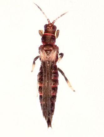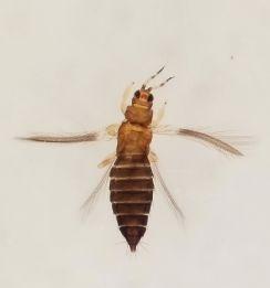 Female T. parvispinus is generally dark coloured (though the head and thorax can be lighter than the abdomen), has bright red ocelli and clear patches at the top of its wings. Male T. parvispinus are yellow, and more closely resemble more common thrips such as onion thrips (T. tabaci). Both males and females are small (females: up to 1mm long) relative to western flower thrips (up to 2mm).