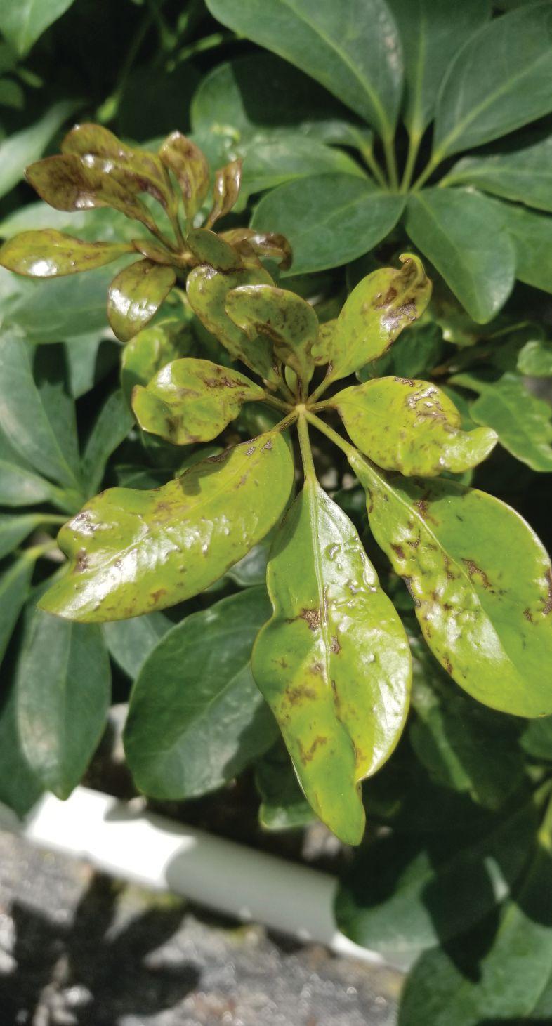 Figure 2. Damage from Thrips parvispinus causes heavy brown streaking on leaves, leaf distortion, and new leaves may not emerge properly.