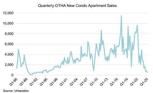 Area new condo apartment market reported a total of 533 sales in the first quarter of 2025, declining 62 percent year-over-year and 88 percent below the 10-year average to reach the lowest quarterly total since 1995. The 215 new condo sales in the city of Toronto in Q1 fell to its lowest level since 1990, according to the Q1-2025 Condominium Market Survey by Urbanation Only two projects launched for presales in the first quarter, totaling 275 units. Since the beginning of 2024, 28 presale projects totaling 5,734 units were either put on hold, cancelled, placed in receivership, or converted to purpose-built rental, including four projects totaling 1,042 units in Q1.