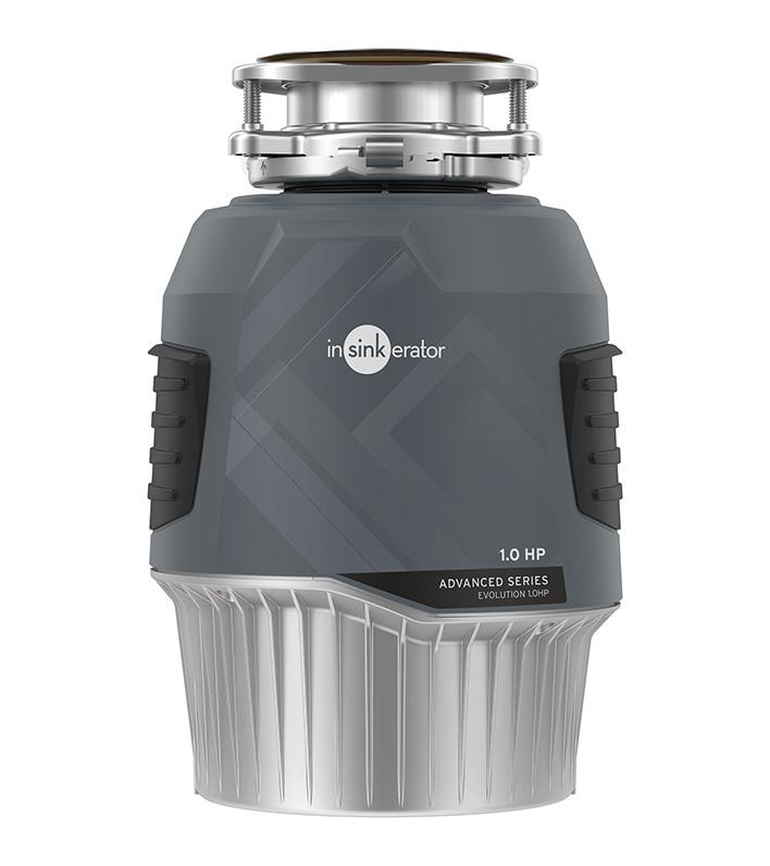 The Evolution 1.0HP garburator by InSinkErator, the quietest disposal among leading brands, is equipped with SoundSeal technology, featuring a custom-molded sound jacket, antivibration mount technology and tailpipe coupler, and the Quiet Collar sink baffle to reduce noise and vibration.