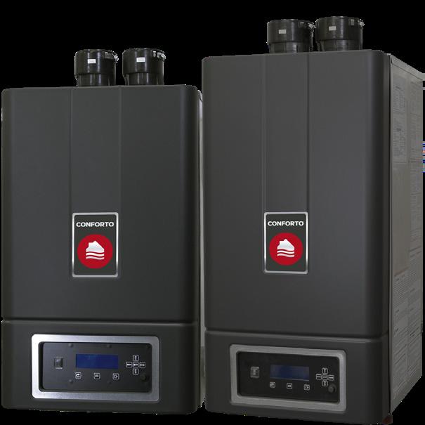 Experience 95%+ efficiency with the new Conforto condensing gas boilers for residential and commercial use. Features include 10:1 turndown ratio, flexible venting up to 150 ft, cascade control for 16 units, and an intuitive 18-language display.
