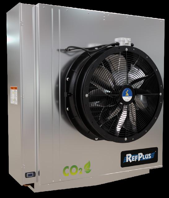 The EX-Series CO2 evaporator from RefPlus is a large industrial walk-in unit equipped with 31.5 inch highefficiency, low-noise industrial fans. This high-output evaporator is ideal for industrial refrigeration and food production, such as refrigerated warehouses and cooling or freezing tunnels. It’s stainless-steel construction and steel-plated hardware are anticorrosive.