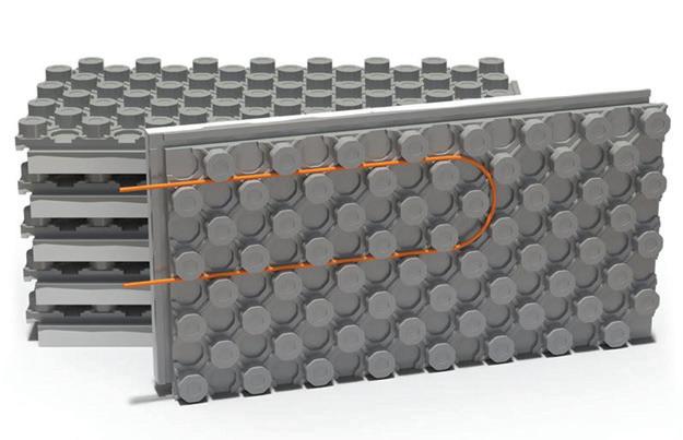The Ampex radiant floor heating panels from Alleguard combine rigid insulation, a vapour barrier and a PEX tubing locking mechanism into a single solution that reduces installation time. The patented “mushroom” shaped nubs lock PEX tubing in place without staples or zip ties.