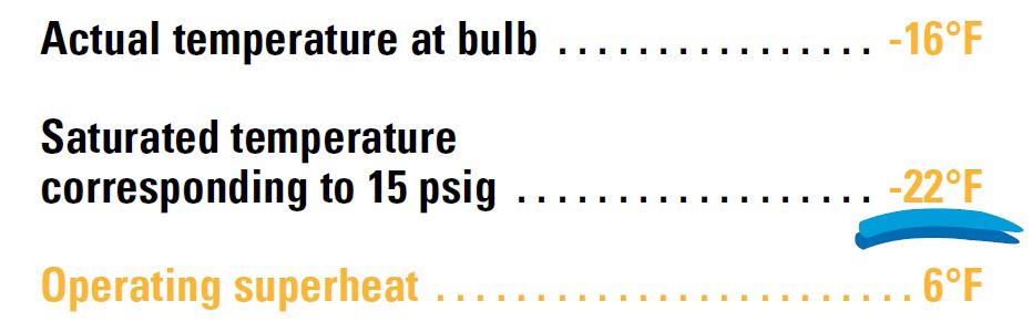 Pressure and temperature are required to calculate the superheat. Since the TEV controls superheat at its bulb location, this is where the measurements must be made. Measuring the pressure establishes the saturation temperature at the bulb location. Knowing the actual temperature at the bulb will reveal whether the refrigerant is superheated (vapour) or saturated (liquid and/or vapour). Subtracting the saturation temperature from the actual temperature will yield the superheat. Of course, if the superheat is too high the TEV is underfeeding, and if it’s too low the TEV is overfeeding.