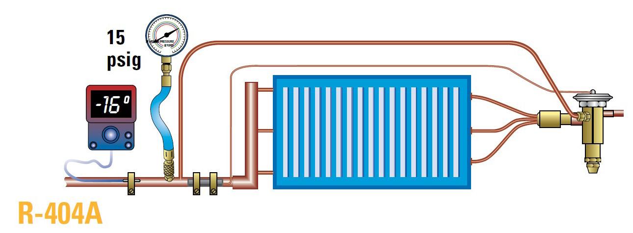 How is the superheat measured? Figure 3 (above) shows a typical low temperature R-404A refrigerant application, and the proper method of measuring superheat.