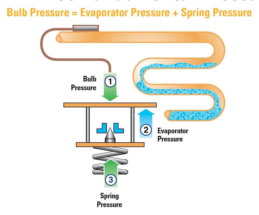 A charge of some fluid is present in the sensing bulb, and it too has a temperature pressure relationship. Team Opening Force (sensing bulb pressure) is influenced by bulb temperature, which then causes the fluid in the bulb to reach a specific pressure. The closing force team has two members: evaporator pressure and adjustment spring pressure.