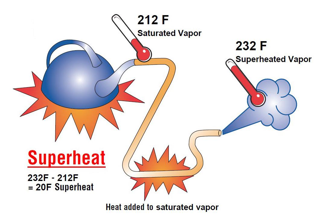 In Figure 1 the saturation temperature is 212F, and the heated vapour temperature is 232F. The superheat is the difference between the two: in this case, 20 degrees.