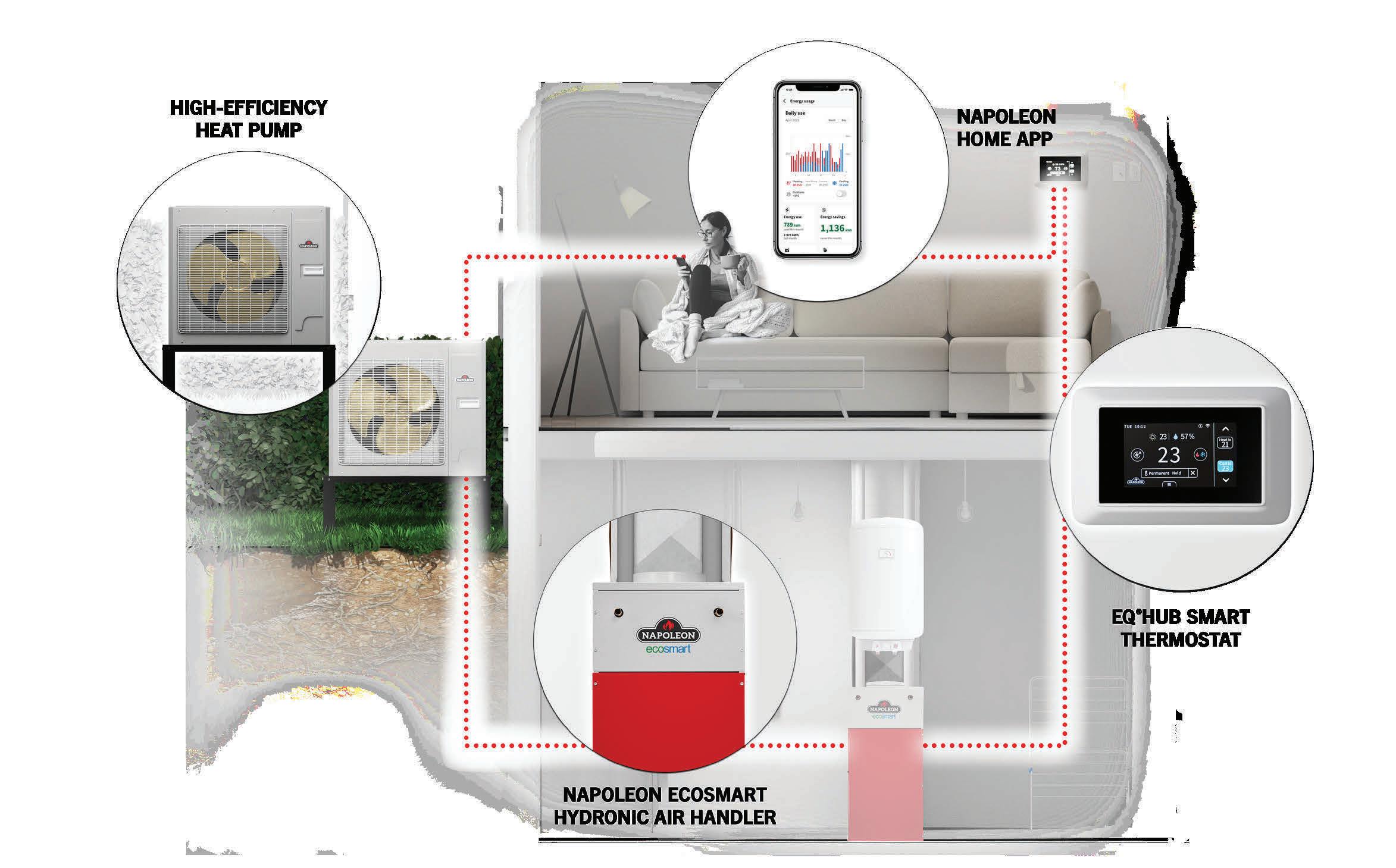 The Napoleon EQ®Fusion Hybrid Solution combines a high efficiency heat pump with a hydronic air handler, all intelligently managed by the EQ®Hub Smart Thermostat for unmatched comfort and energy efficiency.
