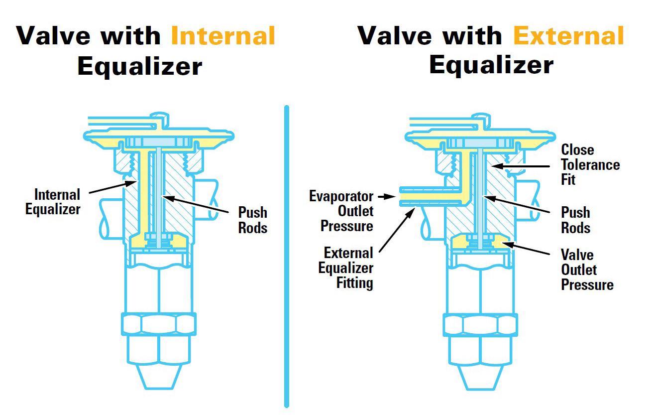 This is what an internally equalized TEV does; uses its outlet pressure as an approximation of the pressure at the evaporator outlet. That pressure is transferred under the diaphragm via excessive leakage around the pushrods or through a dedicated passageway. The external equalized TEV comes with a third fitting on it which allows a connection to be made to the evaporator outlet. This pressure is then allowed to travel through a dedicated passageway in the TEV body to the bottom of the diaphragm (See Fig. 6).
