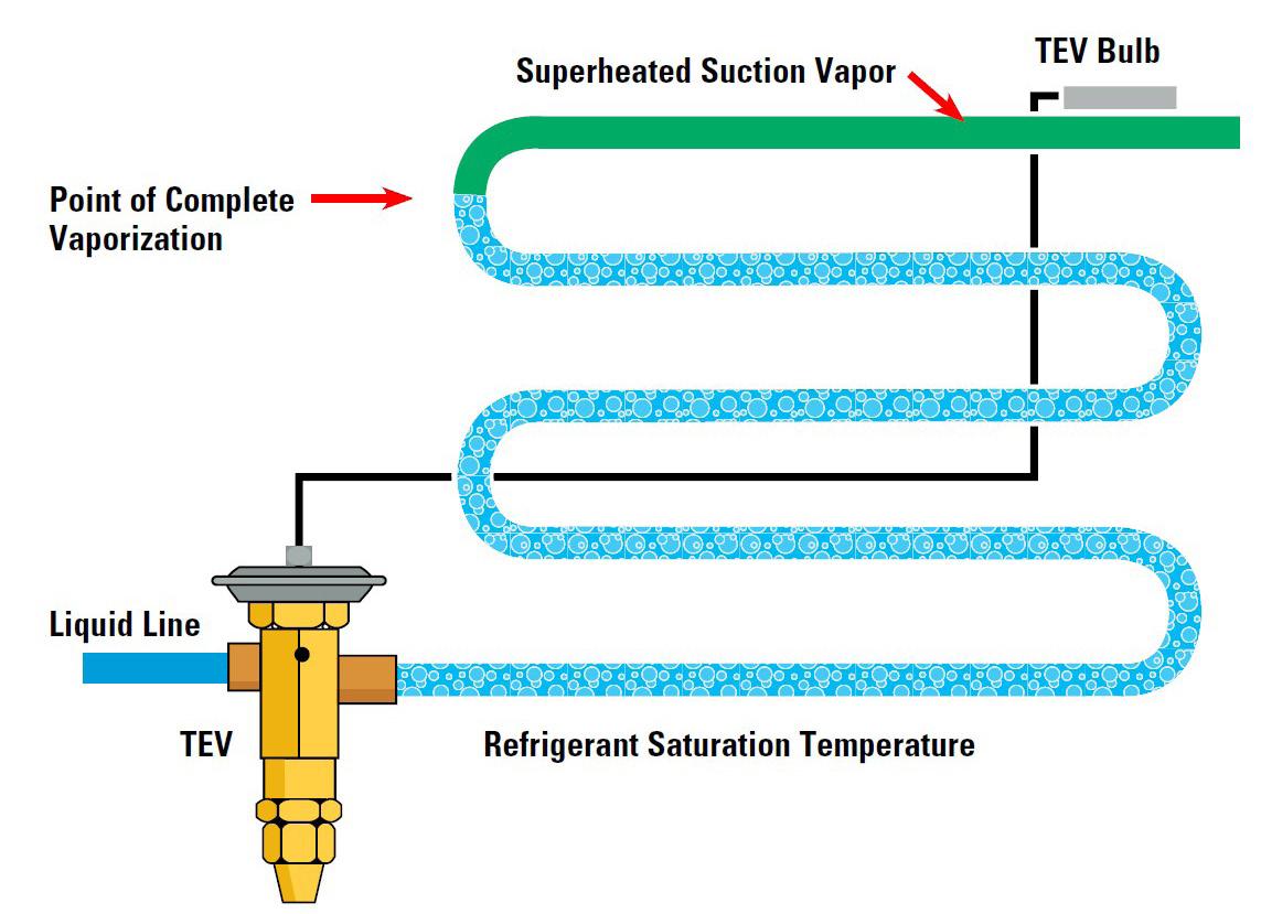 The remaining portion of the evaporator is used to superheat that vapour. As the load increases or decreases, or as the point of complete vaporization moves closer to, or further away from, the evaporator outlet, the TEV will close or open to